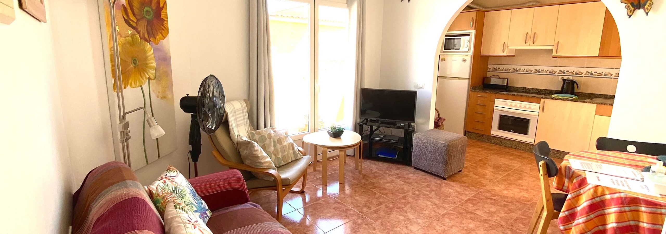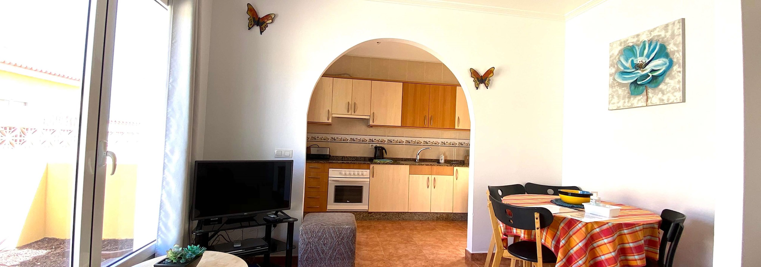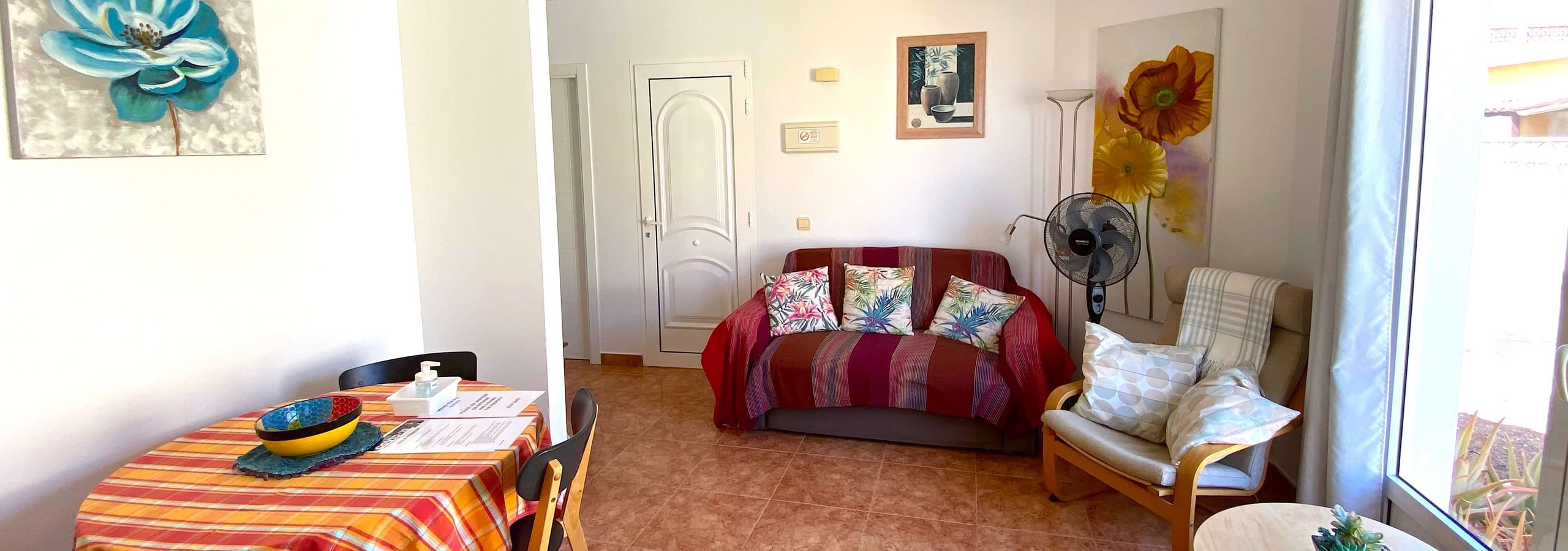 The villa has a private patio area where there is your very own private heated pool (6m X 3.05m) which is cleaned twice weekly and a large canarian style BBQ providing you with the perfect environment to make the most of your villa holiday. The large lounge/dining room has dining table for 4 and a TV system with all UK channels and more.
